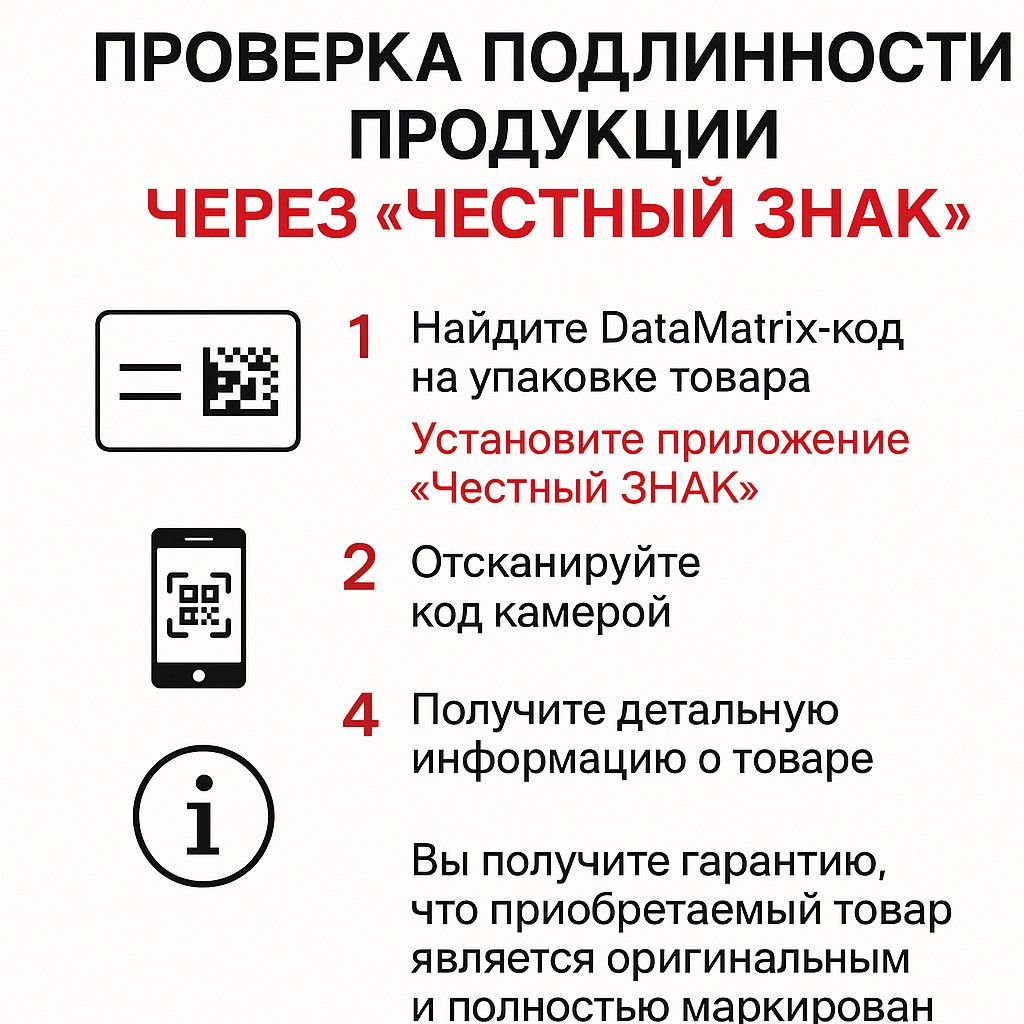 Мы участвуем в системе цифровой маркировки «Честный знак», поэтому каждая единица товара получает уникальный DataMatrix-код, который невозможно подделать.